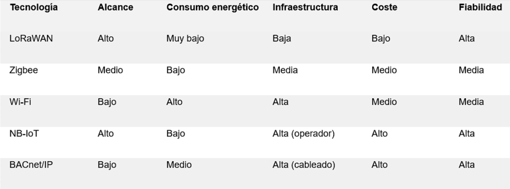 Entre las tecnologías de conectividad disponibles, como Wi-Fi, Zigbee, BACnet, Modbus, y NB-IoT, LoRaWAN (Long Range Wide Area Network) ha ganado relevancia por sus características únicas.